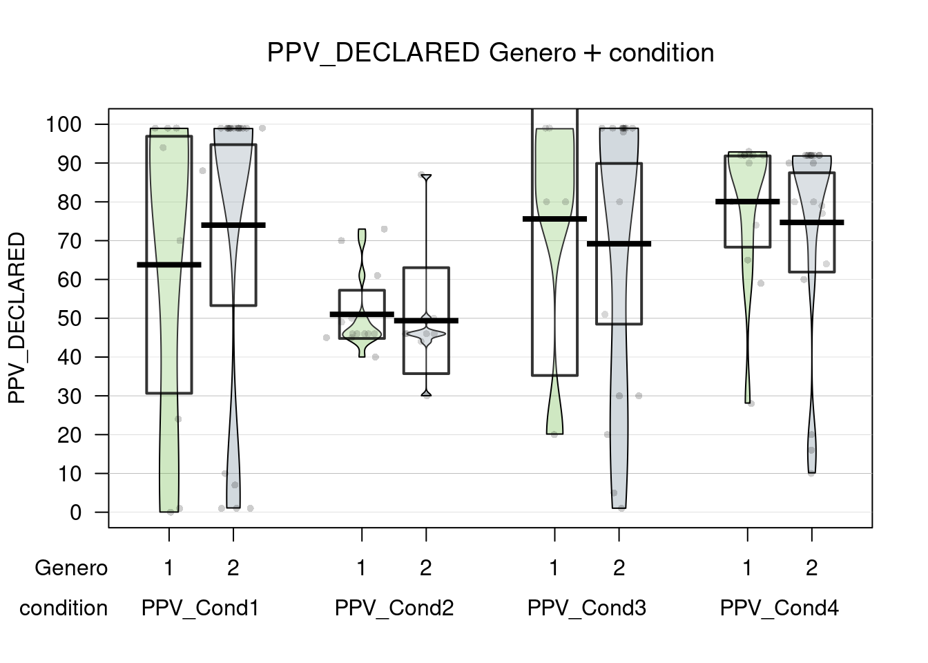Plot.me(PPV_DECLARED ~ Genero + condition, datos)## inf is depricated. Use inf.method instead